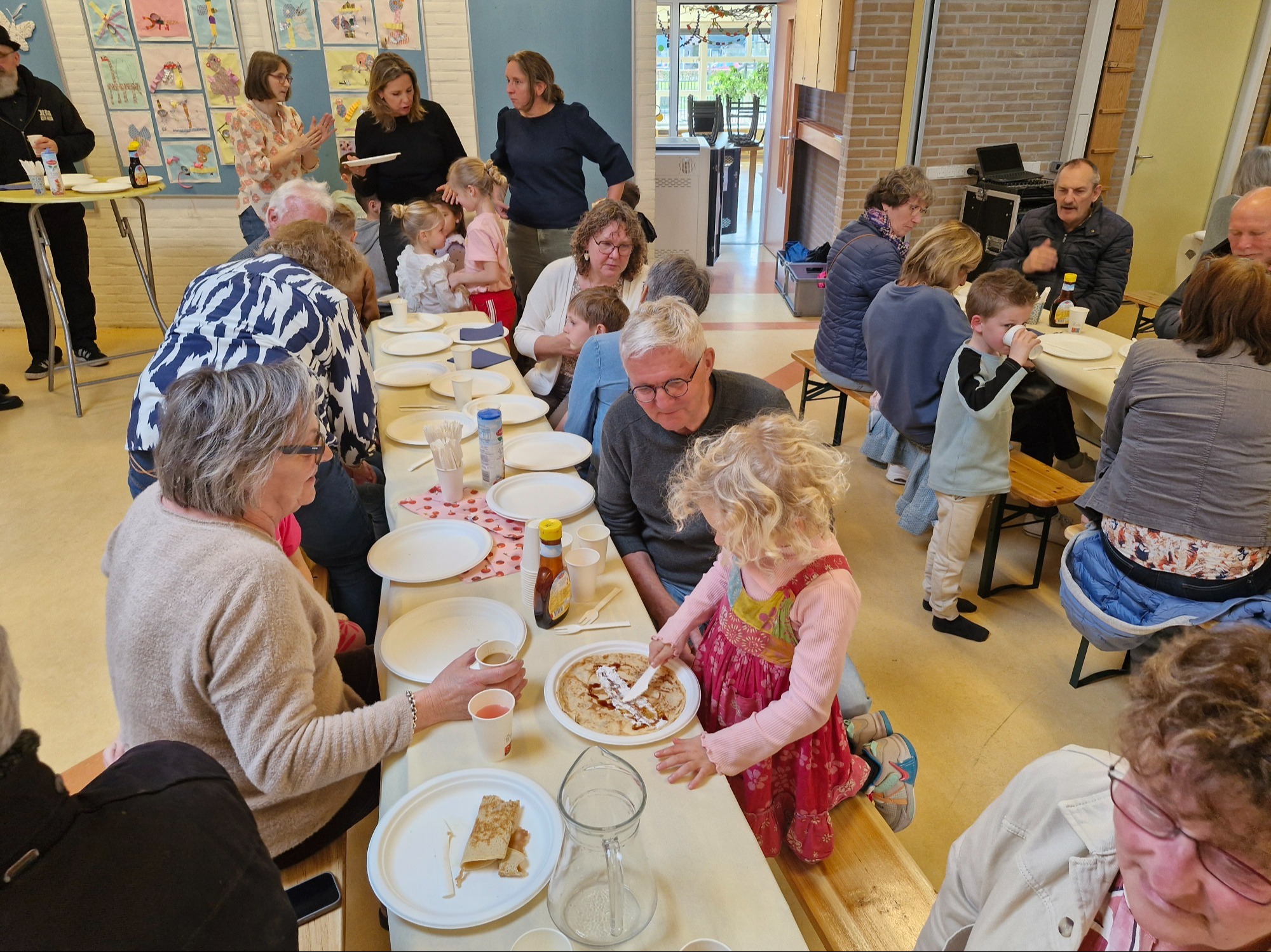 Maart 2026 - Ook dit jaar is de school weer veranderd in een heus restaurant. Alle opa's en oma's waren uitgenodigd om een pannenkoekje te komen eten.